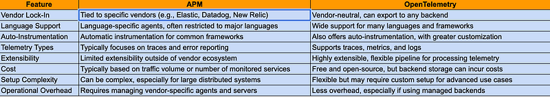 - Vendor Lock-In: Most APM solutions are tied to a specific platform or vendor, making it hard to switch to another monitoring solution without significant rework.