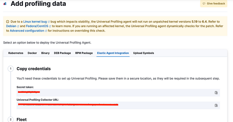 secret tokenandUniversal Profiling Collector urlfrom the Elastic Agent Integration: - Click