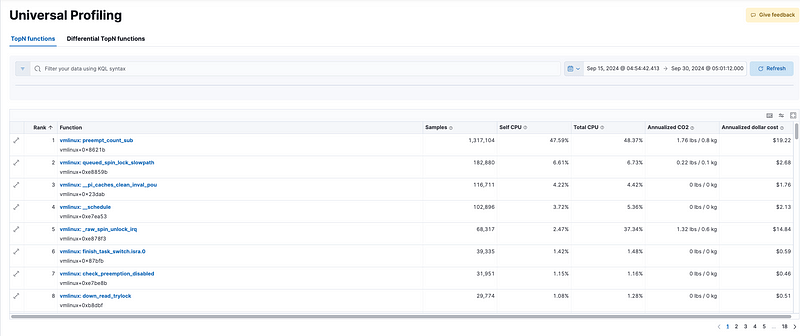 Elastic Universal Profiling has an awesome user interface that instantly displays the impact of any given function, including its CPU execution time, associated costs in dollars, and carbon emissions.