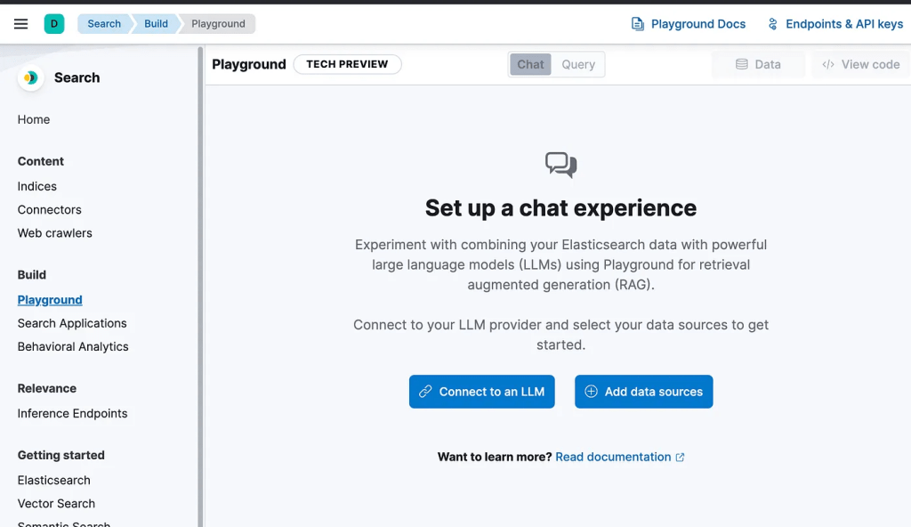 The Elasticsearch Playground in Kibana is a robust environment for experimenting with data queries, AI integrations, and conversational data applications. The Elasticsearch vector database and the Search AI platform offer developers a wide range of capabilities, including comprehensive hybrid search and access to innovations from an expanding list of large language model (LLM) providers.
